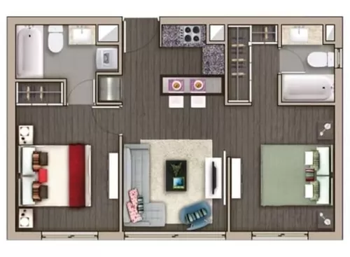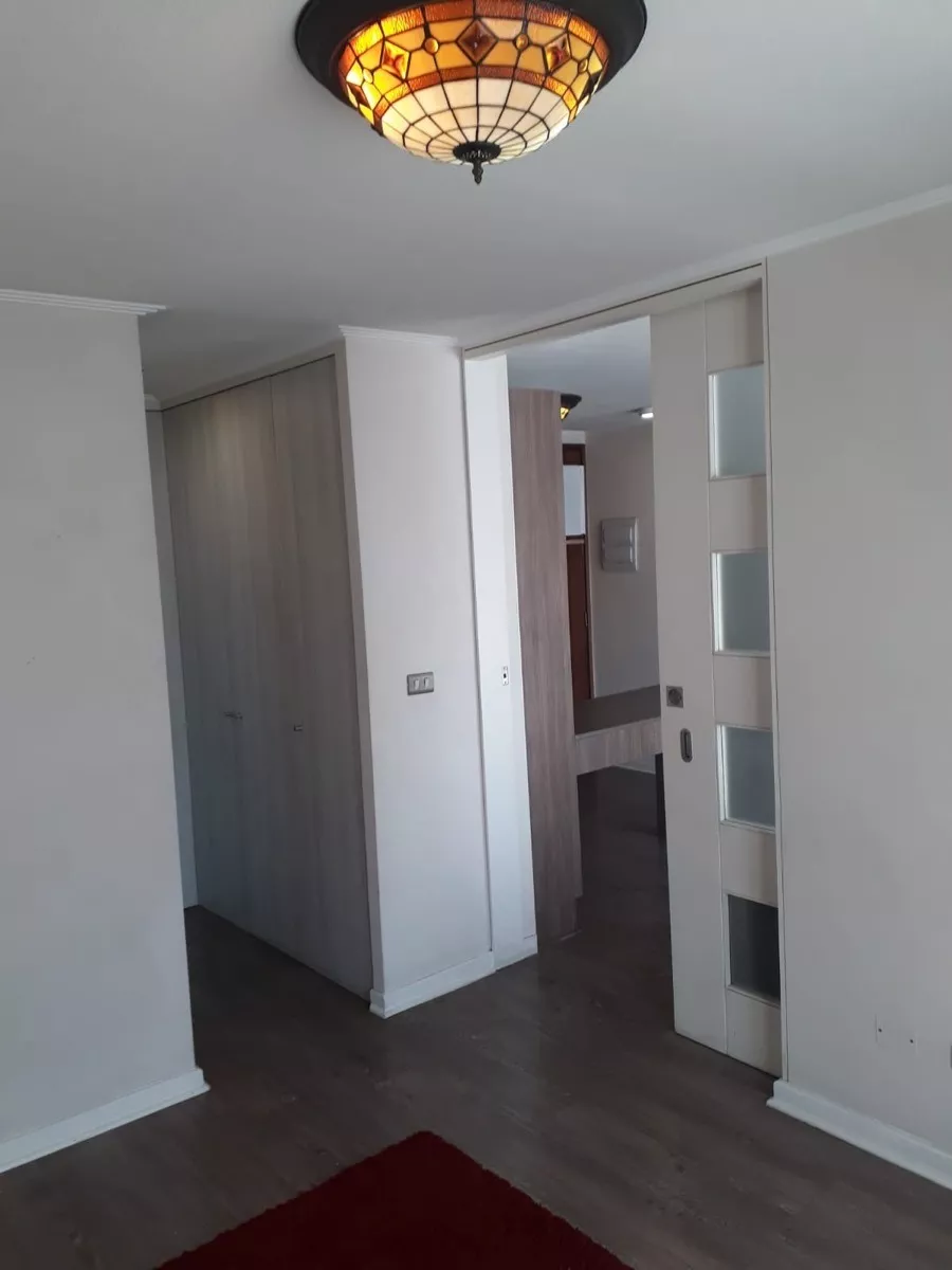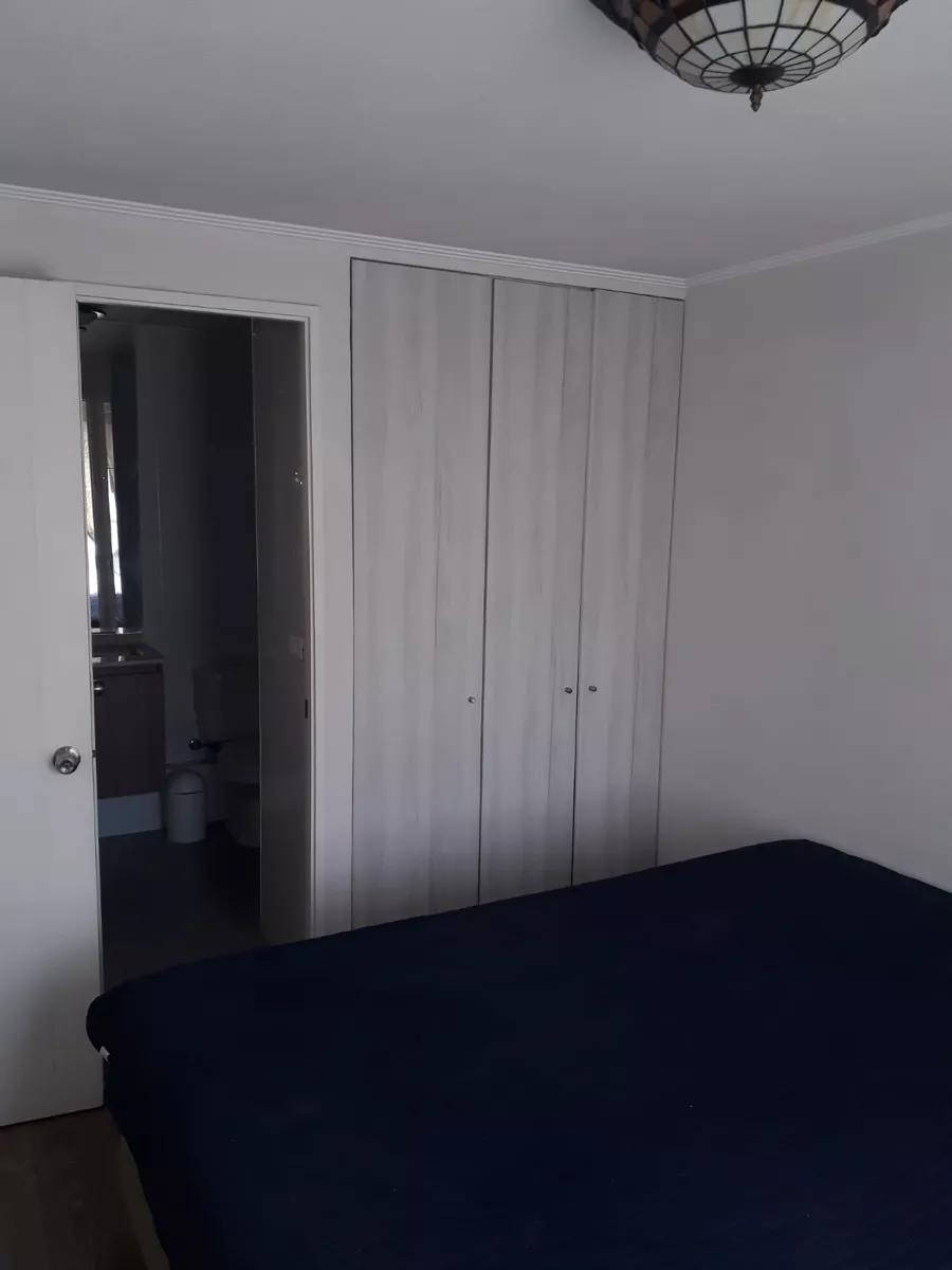 El departamento consta de 2 dormitorios con ventanas termopanel que aíslan el ruido exterior (cada dormitorio cuenta con su propio baño, y uno de los baños posee espacio y conexiones para instalar una lavadora), amplios closets, living y cocina americana (equipada con encimera, horno eléctrico y campana extractora de aire). Ademas cuenta con 1 estacionamiento y 1 bodega.