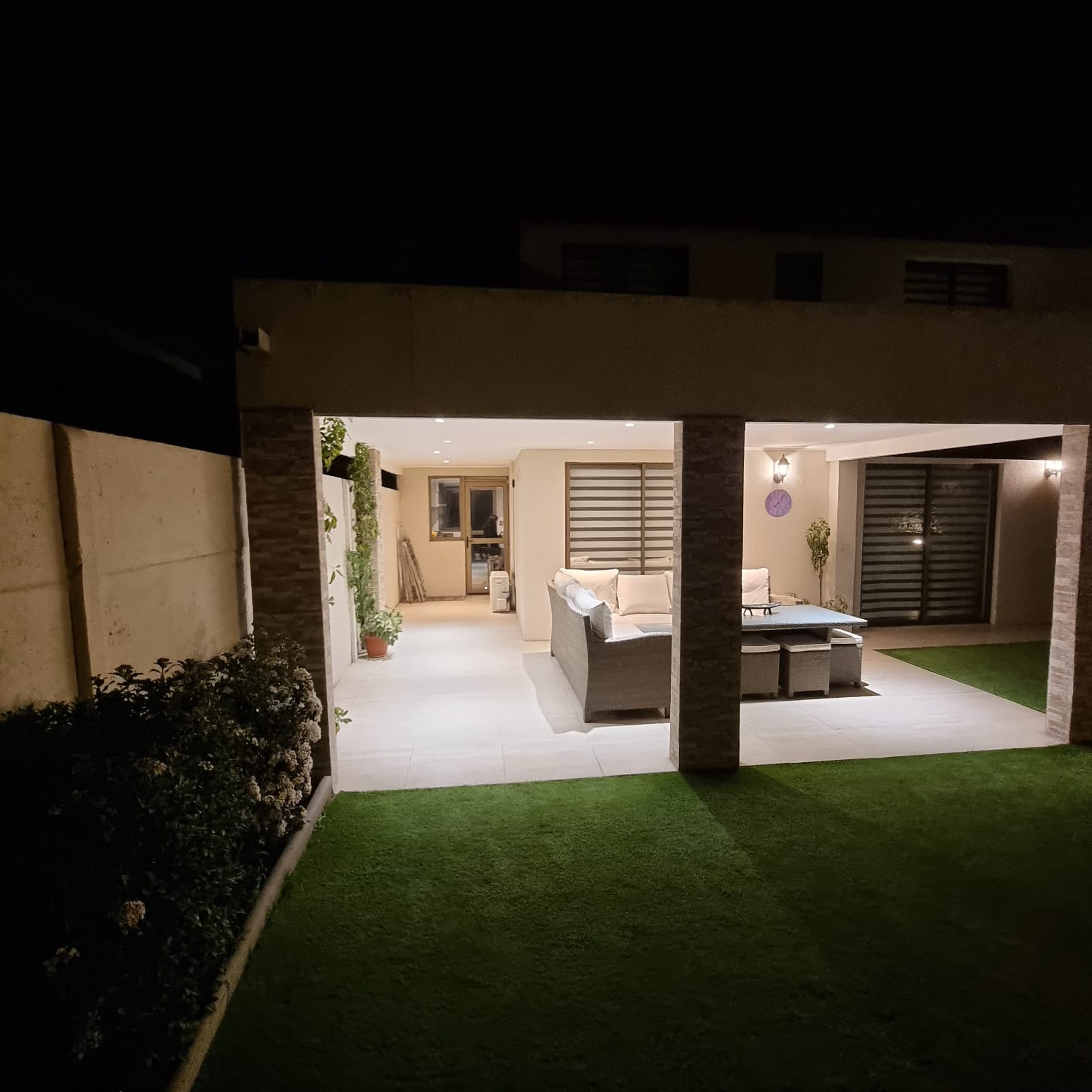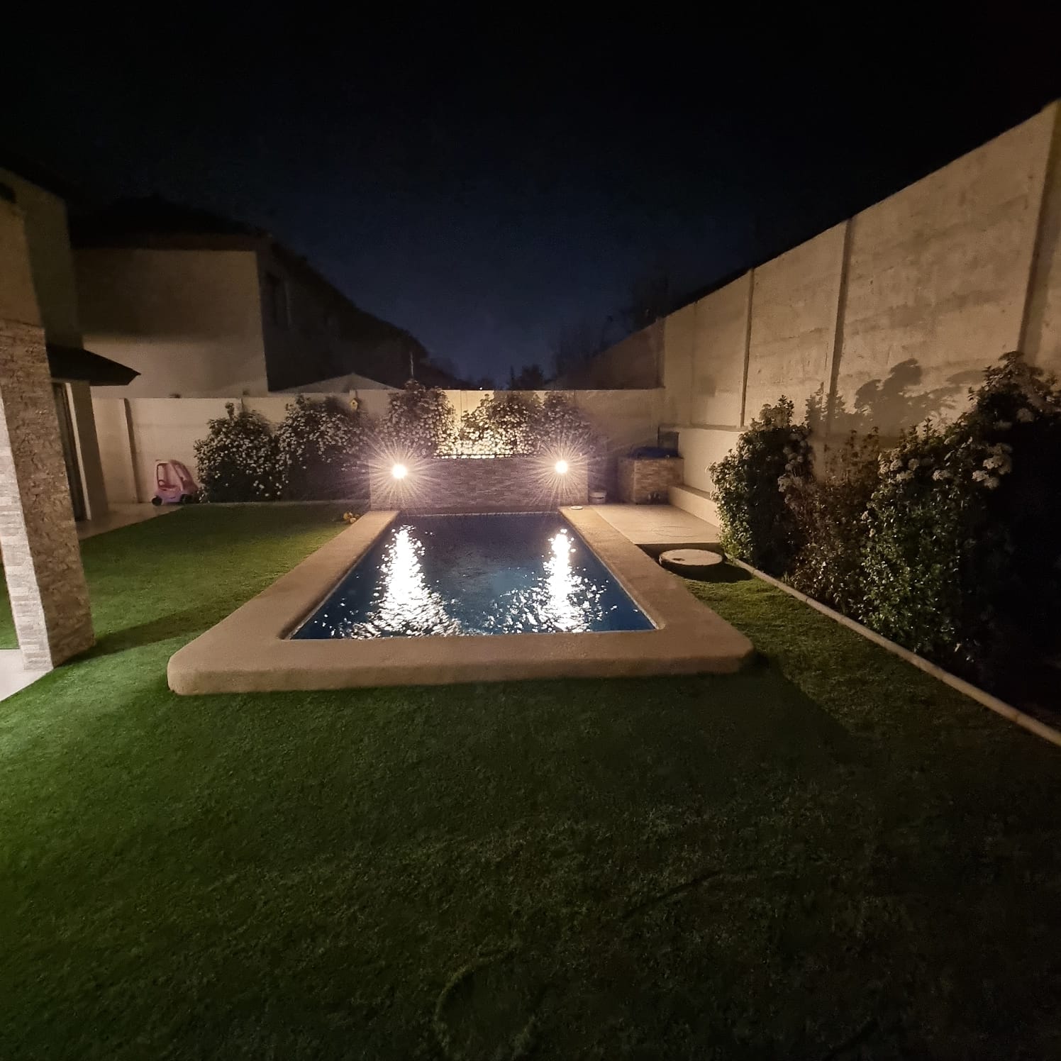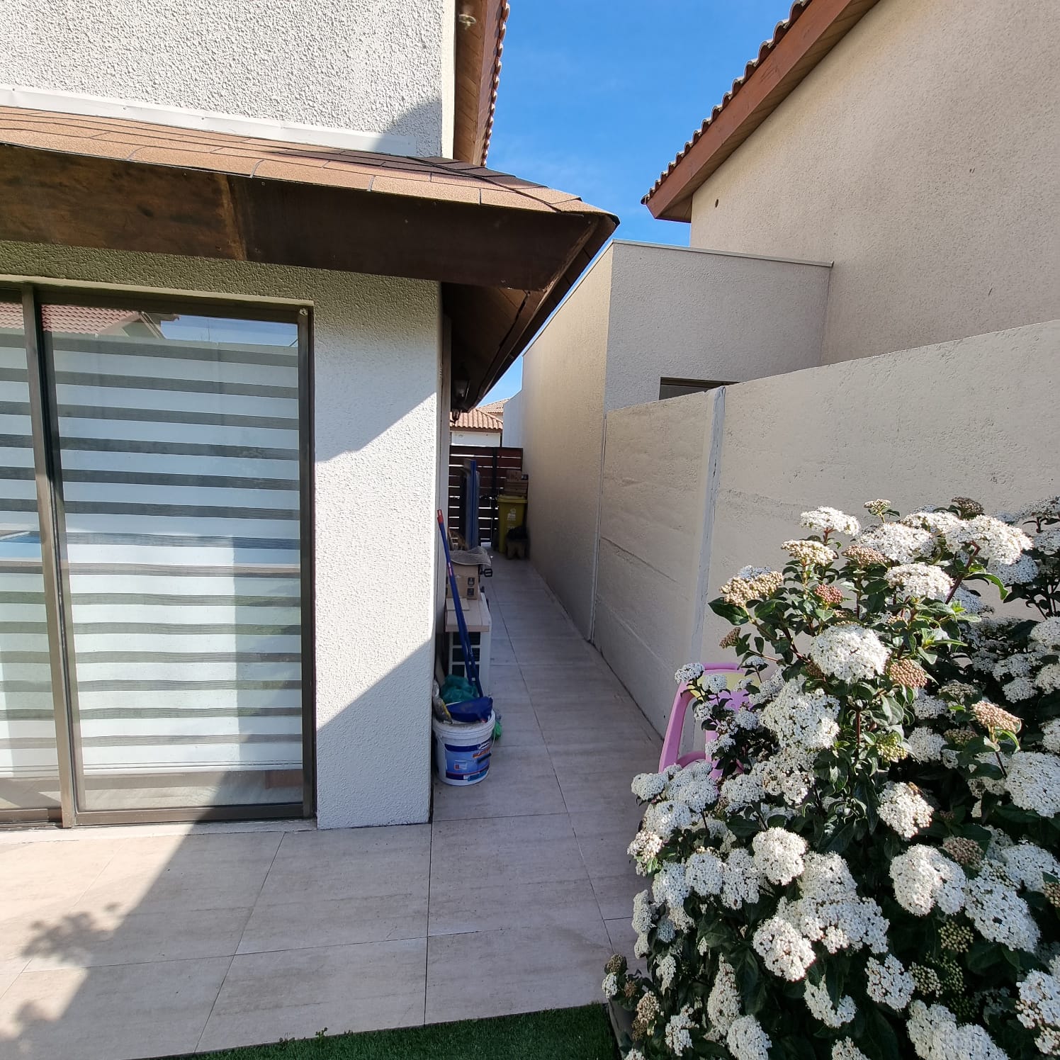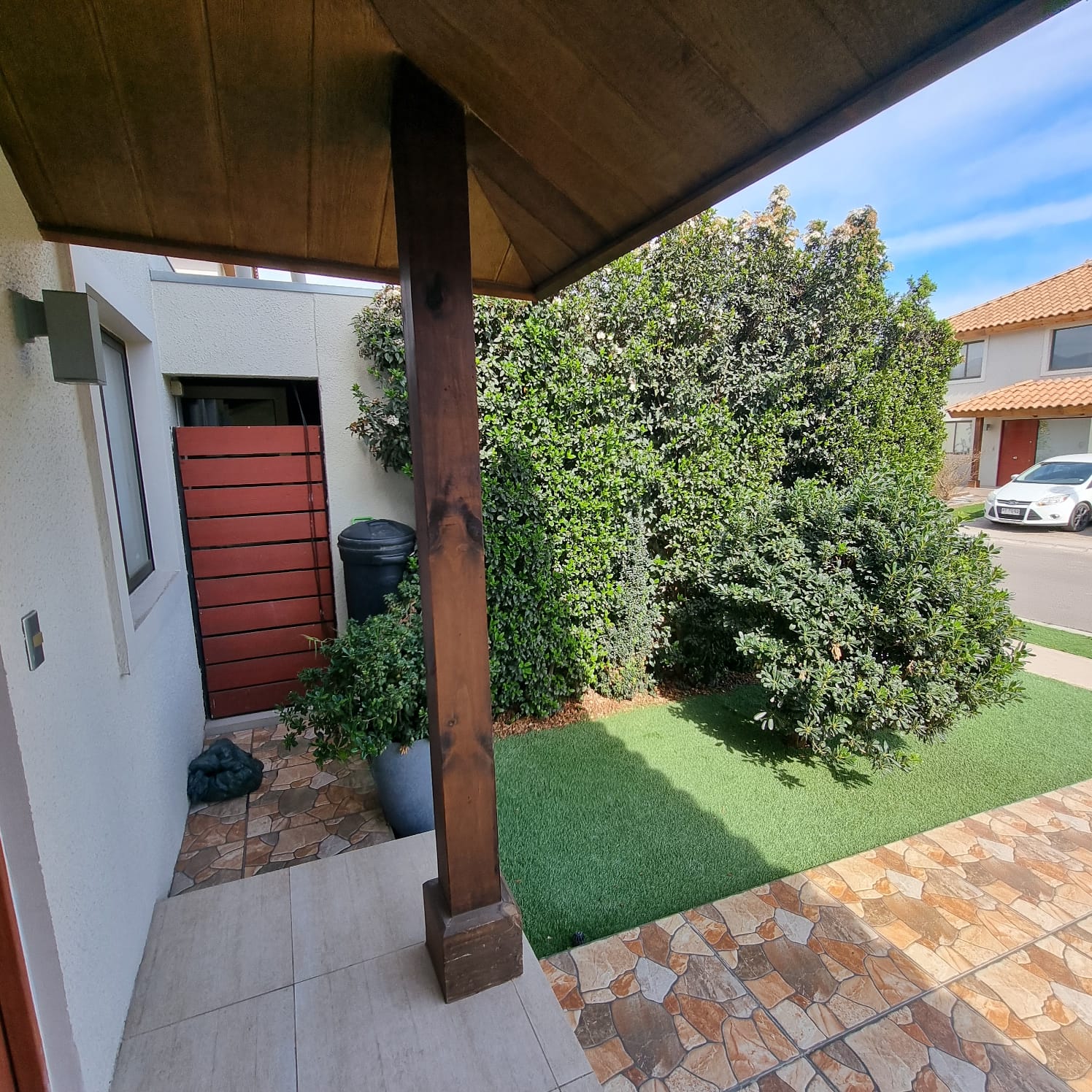 – Jardin exterior en la entrada con pasto sintetico y regadío por gota en sector arbustos