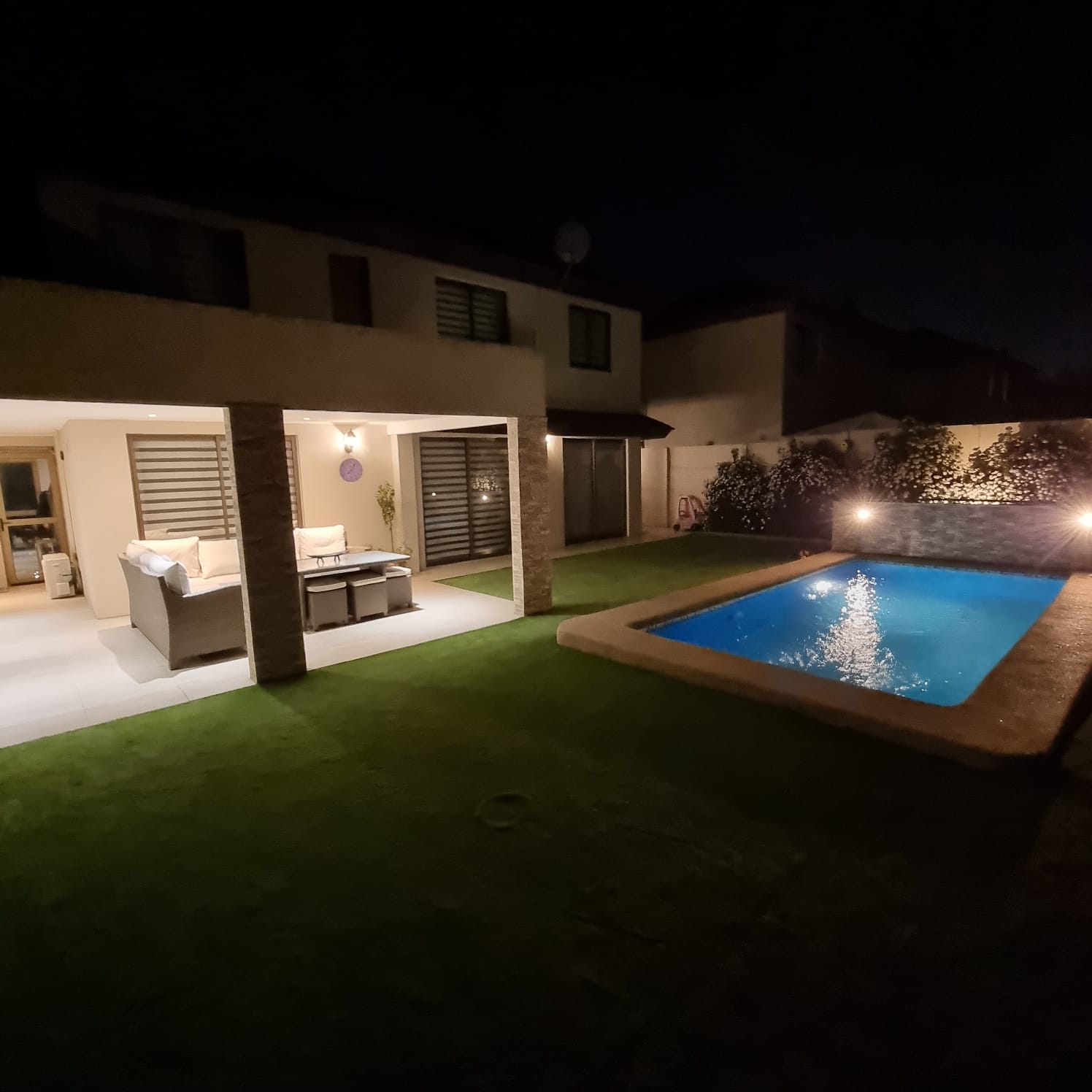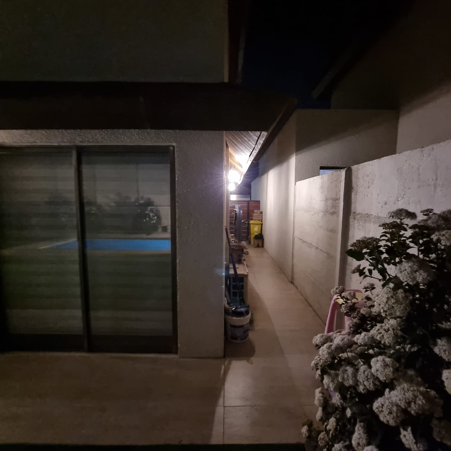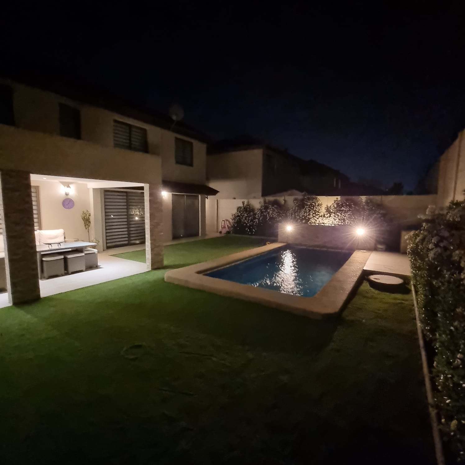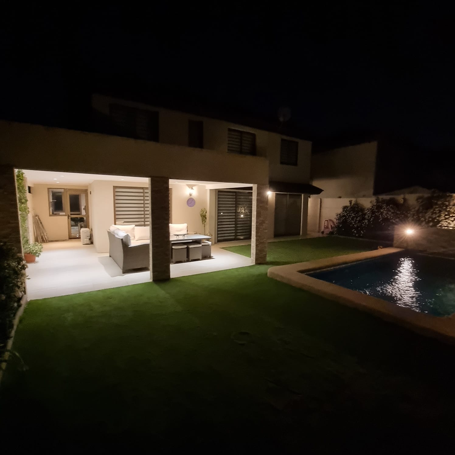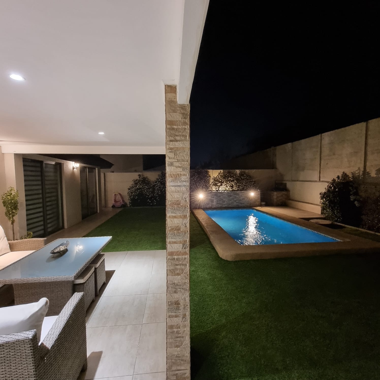 – Jardin exterior en la entrada con pasto sintetico y regadío por gota en sector arbustos