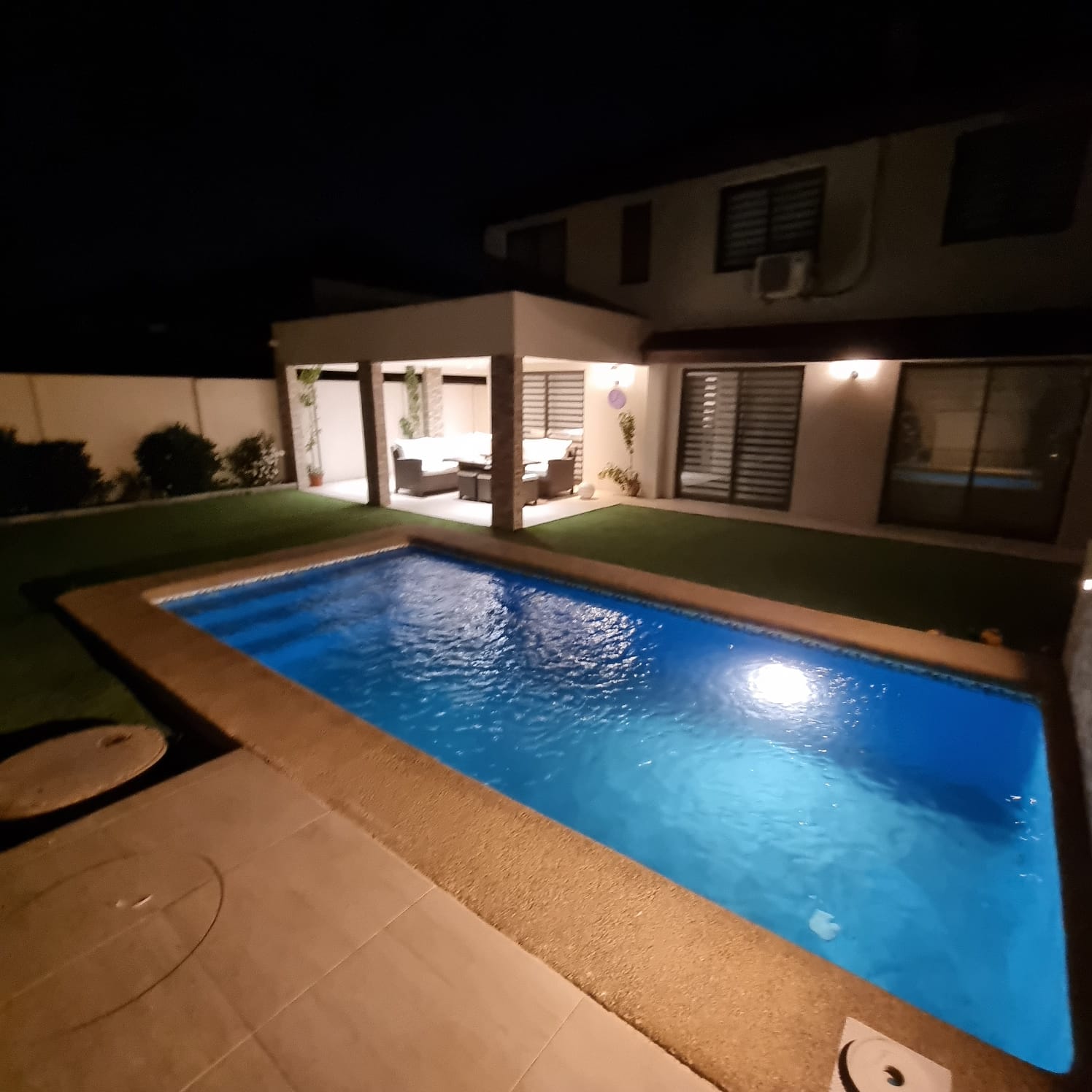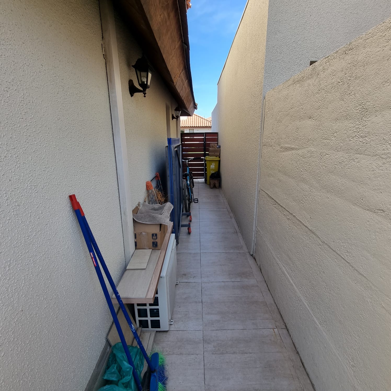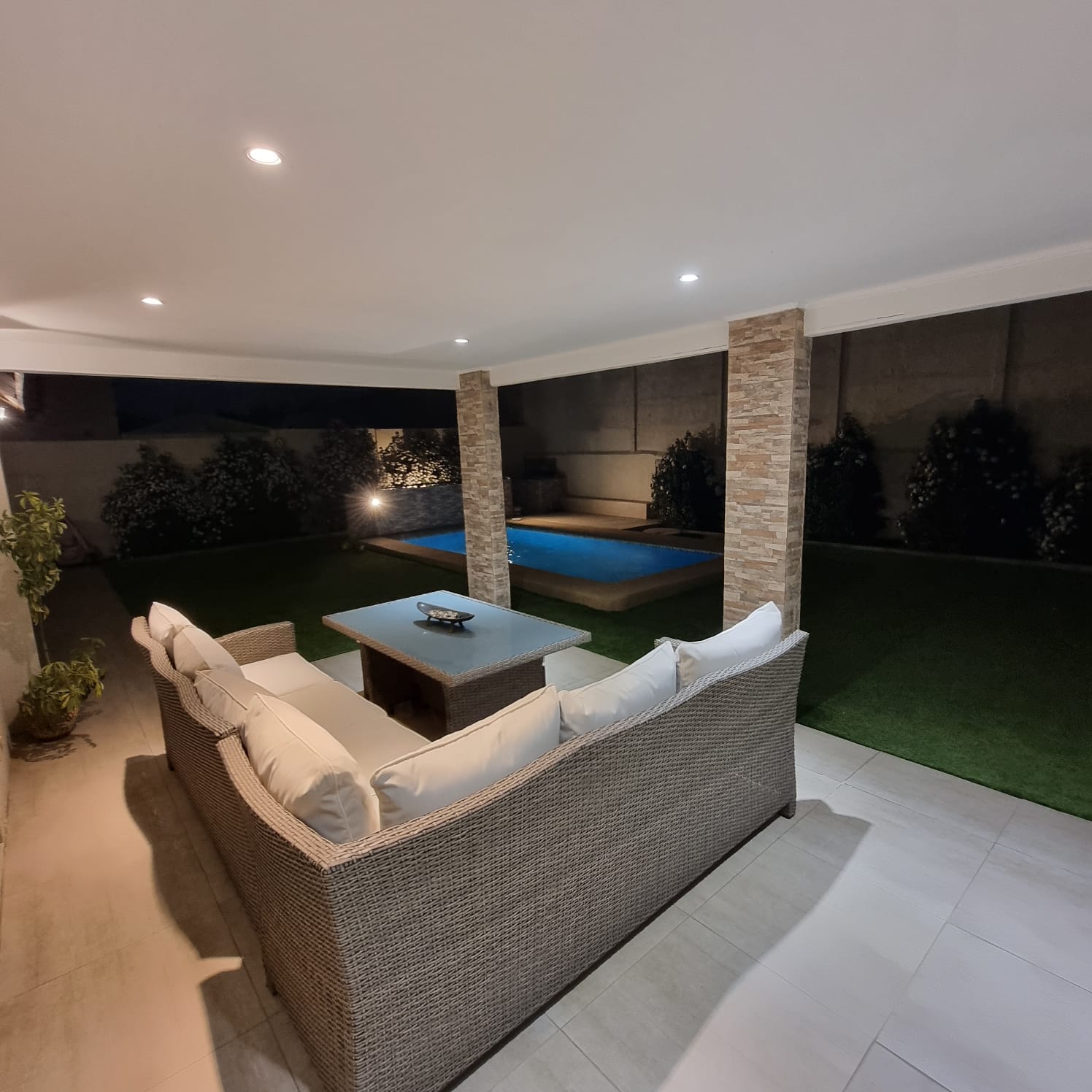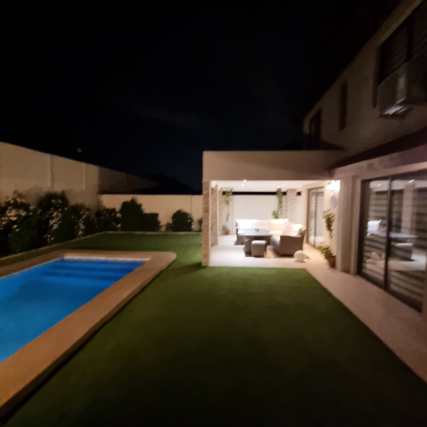 – Jardin exterior en la entrada con pasto sintetico y regadío por gota en sector arbustos